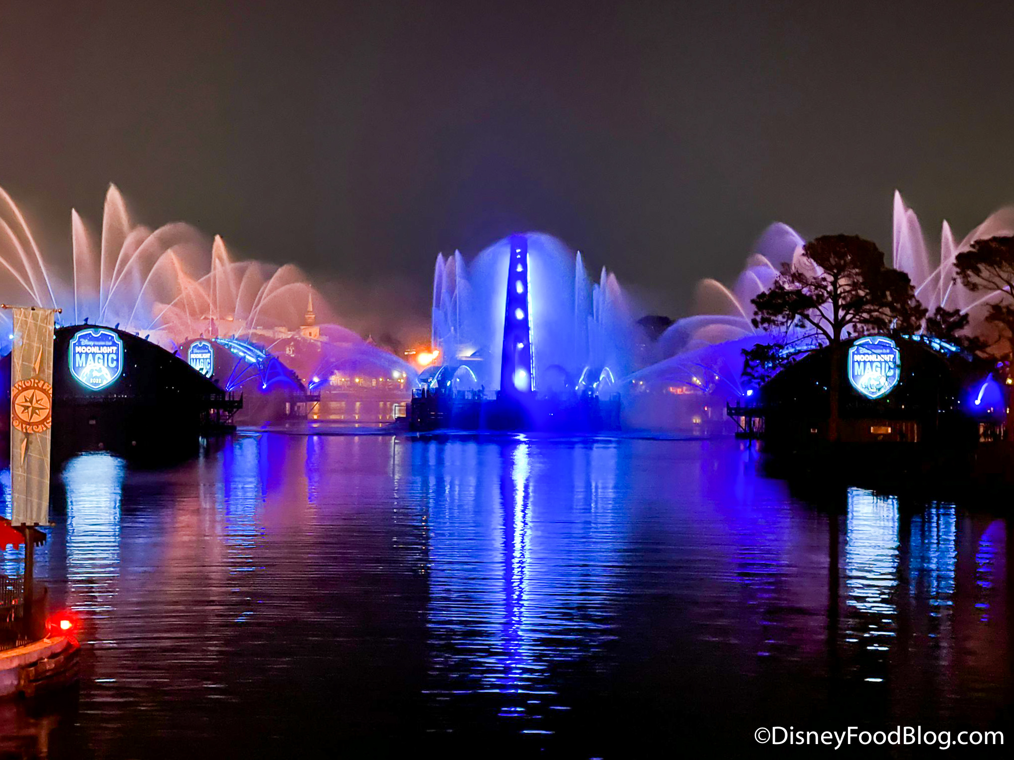 And, there was a Disney Vacation Club Welcome Home Moment that happened twice during the event — at 11PM and 12AM. The barges used for the Harmonious fireworks in the middle of the World Showcase Lagoon were lit up with the Disney Vacation Club logo and the water features were turned on.