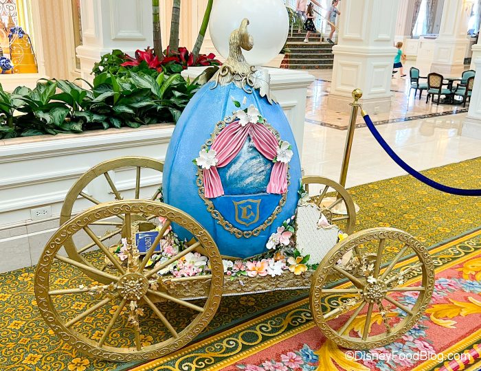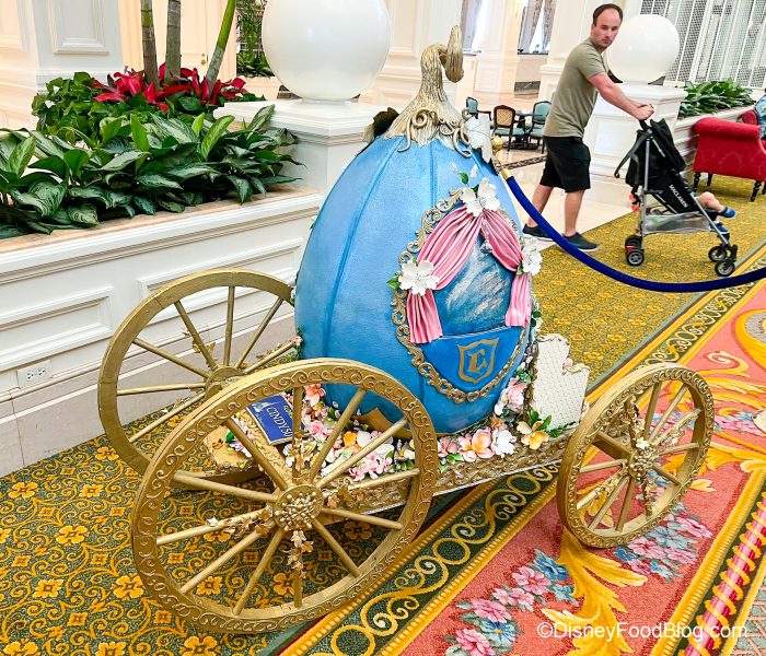 We’ve seen some of their gorgeous work over the years with beautiful chocolate sculptures dedicated to Cinderella Castle and Ratatouille, as well as the massive holiday gingerbread house they build around the holidays. Now, though, these craftspeople of edible art have done it again — this time with chocolate Easter eggs! This egg display can usually be found at the resort around the holiday, but this year, there’s ONE egg (or CARRIAGE) that stands out above all the rest.