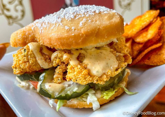 Now let’s move on to the Oyster Beignet Po’Boy, which is a Mickey-shaped Beignet with Fried Oysters, Lettuce, Tomato, Cajun Rémoulade, and House-made Pickles and served with potato chips for $15. The biggest issue we had with this dish was the structural integrity of the sandwich because the beignet kind of fell apart under the Cajun Rémoulade.