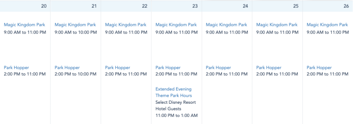Magic Kingdom will be open next week from 9AM to 11PM. And, if you’re staying at a Disney World Resort hotel that qualifies you for Extended Evening Theme Park Hours, you can take advantage of those on Wednesday, March 23rd from 11PM to 1AM.