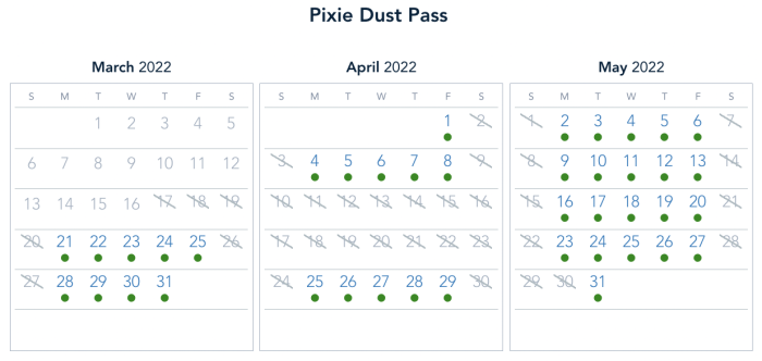 However, Pixie Dust Pass holders will only be able to book park passes March 21st through March 25th as March 20th and 26th are blockout dates.