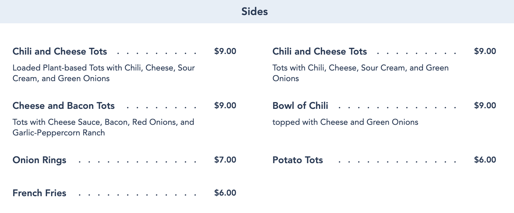 Both menus also include sides (or starters & shareables as The Fountain calls them). Beaches & Cream has various Tater Tot Sides for $9 and there are some fries and other things for around $6.