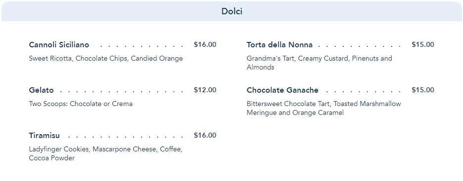 Once you’ve chowed down on cheeses and pastas, you can finish up with the Dolci course. That’s dessert!