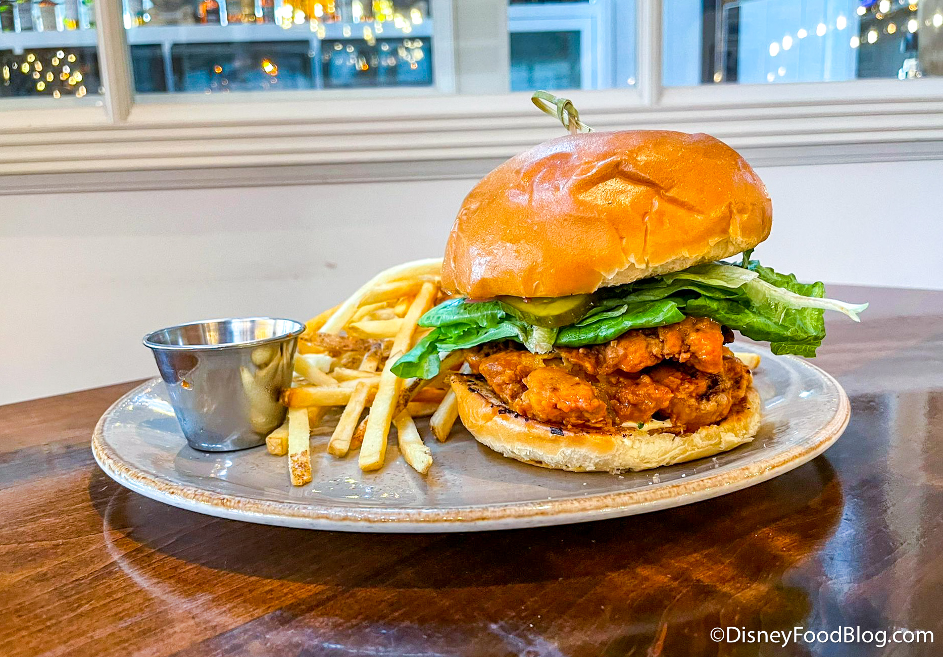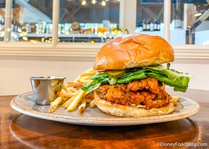 This is the brand new Nashville Chicken Sandwich from Wolfgang Puck Bar & Grill! It’s has hot sauce, pickles, pickled red onions, blue cheese, and baby gem lettuce all on a brioche bun for $18.