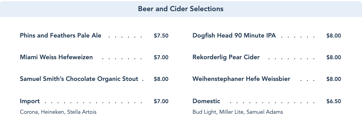 There is also a selection of Beer and Ciders to choose from if that’s more up your alley! If you head to the Dolphin’s website and look at the menu for Shula’s there, you can see a more extensive list of alcoholic beverages included single malt scotches, Champagne, and more.