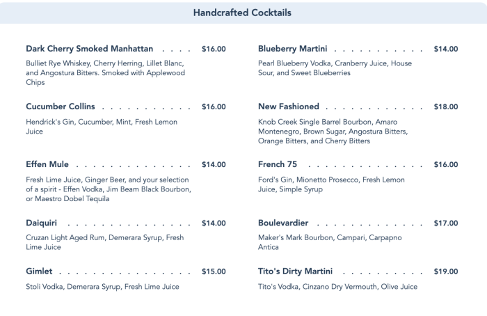 Looking for an adult beverage to pair with your meal? There are a number of Handcrafted Cocktails to try, including a Dark Cherry Smoked Manhattan, a “New” Fashioned, and a French 75.