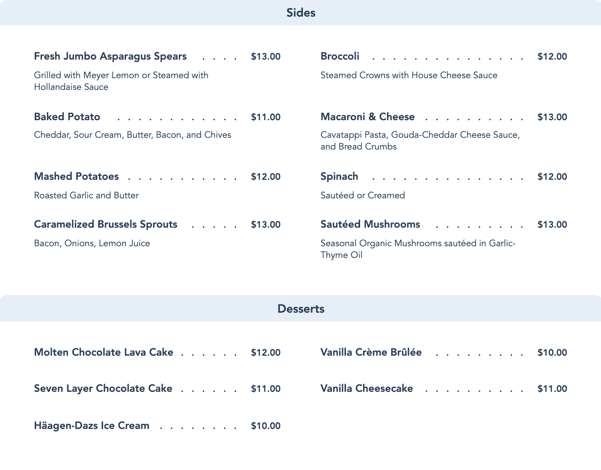 If you aren’t feeling the steak options, there are additional Entrees to choose from, including Roasted Brick Chicken and Norwegian Salmon.