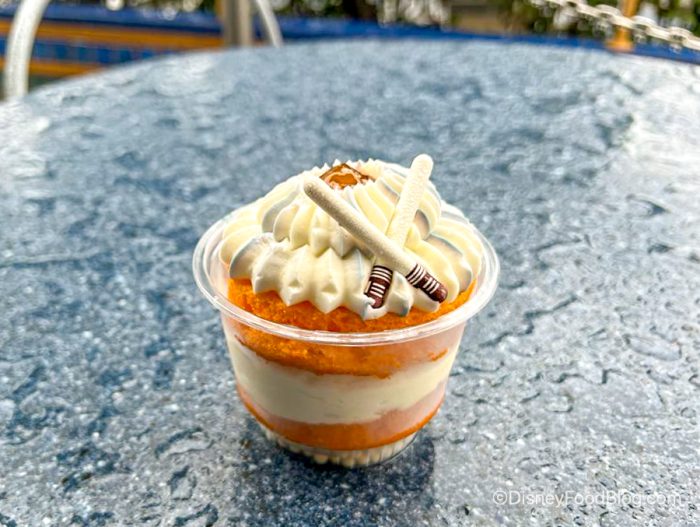 This new treat can be found over at Galactic Grill in Tomorrowland. Previously, we spotted a Pistachio Cherry Chocolate Parfait here that reminded us of The Book of Boba Fett.