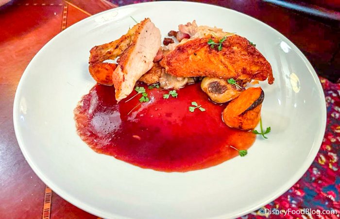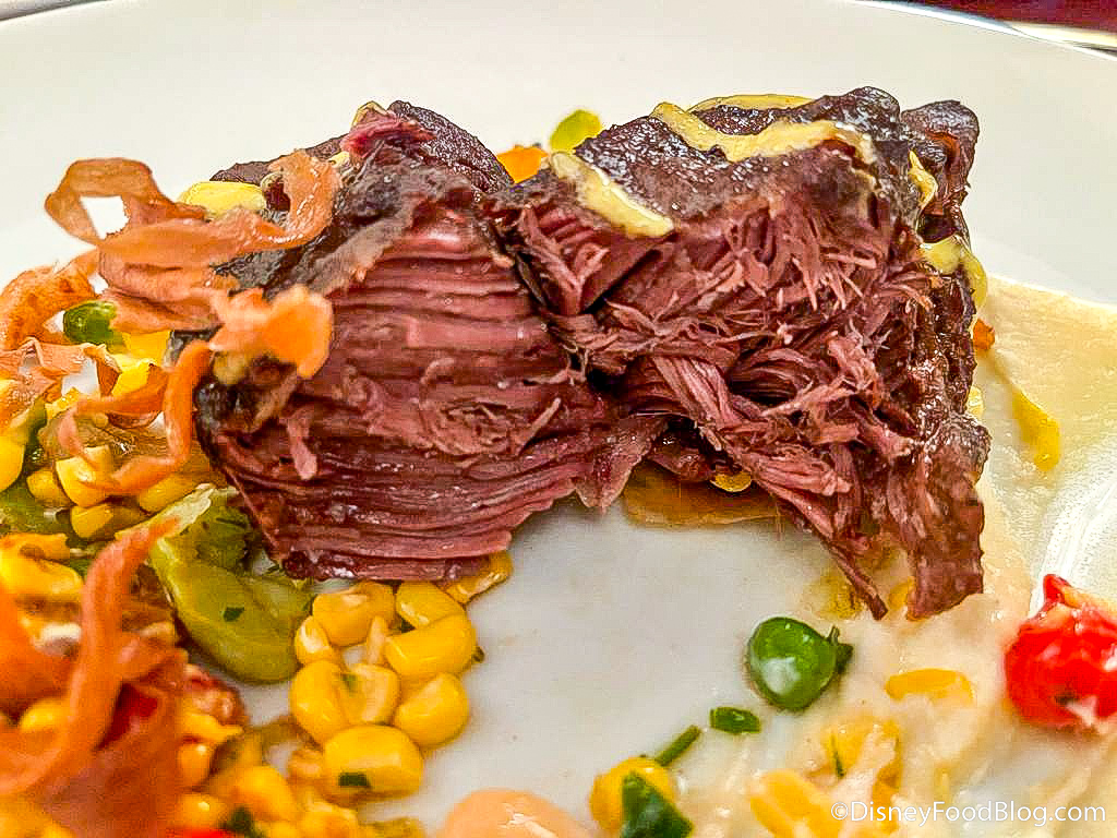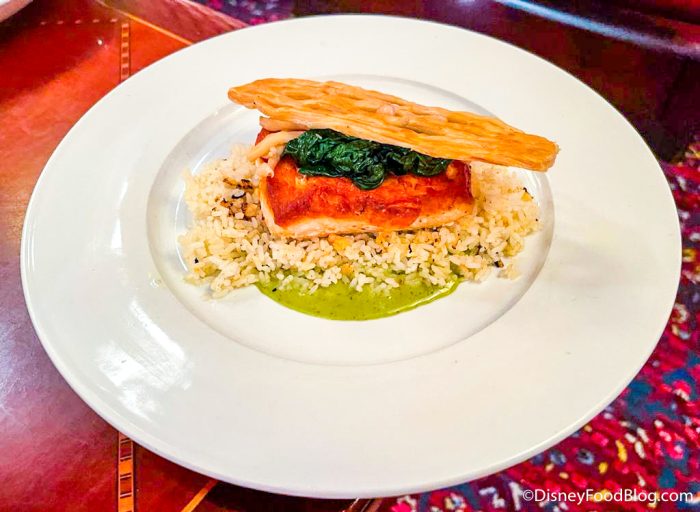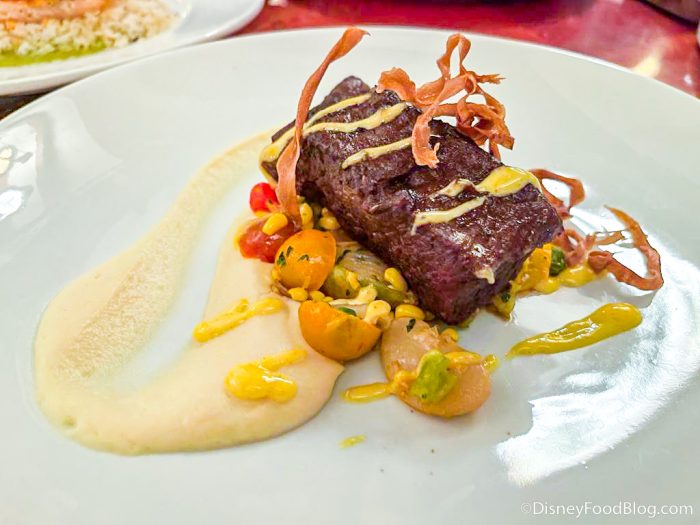 Moving on to the Tomato Risotto (another NEW dish), this comes with Eggplant Fritters and Pepper Relish for $29. This is a vegetarian option, and while our server said it is plant-based, it is not specifically marked that way on Disney’s online menu, so be sure to double check before you order it!
