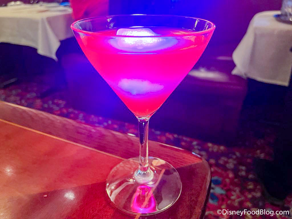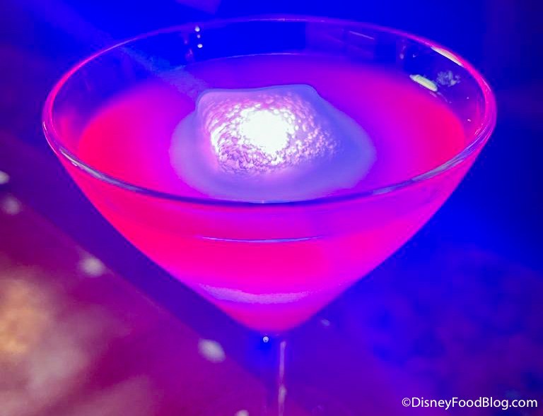 It has Gentleman Jack, Florida honey syrup, and pink grapefruit juice, and comes with a souvenir glow cube. The drink used to come with a little bowler hat glow cube floating in it (SO FUN), but it sadly does not anymore and we got a regular glow cube instead. 😭