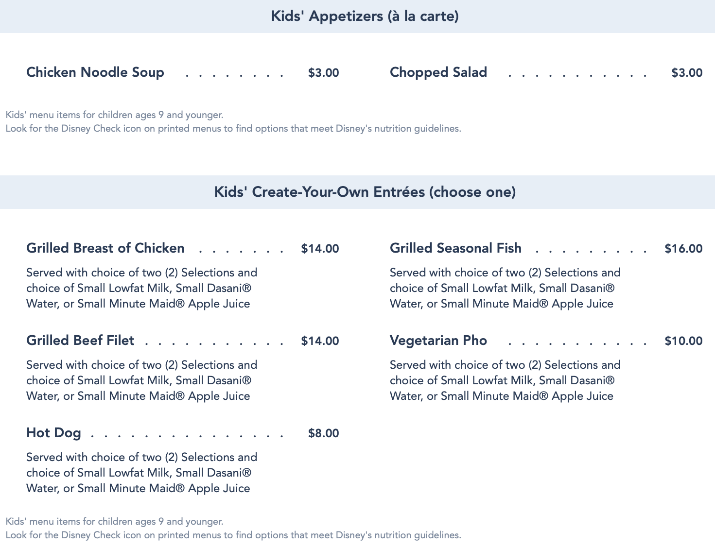 Kids can then add 2 sides to their meal, with options such as Mashed Potatoes or Sliced Apples. There are also some non-alcoholic drinks on the menu, like the EARidescent Sip-a-bration.