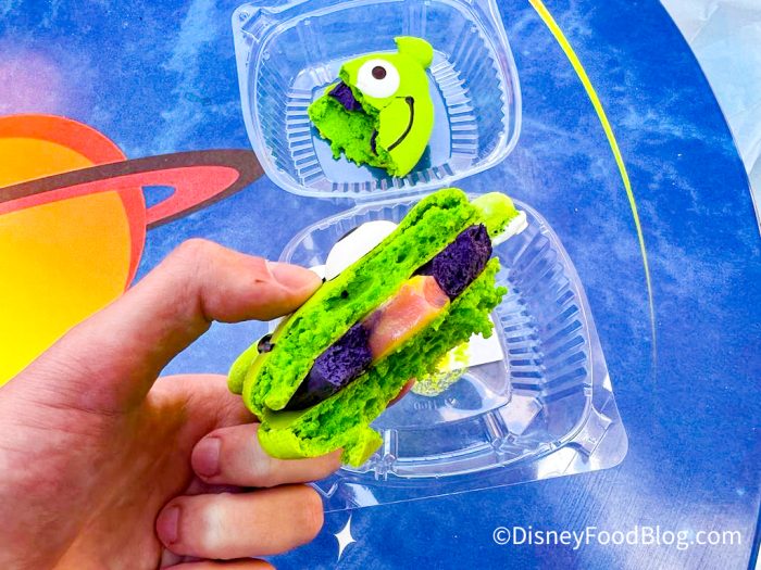 And, we couldn’t leave Alien Pizza Planet without getting the Toy Story-themed dessert that we mentioned earlier — The Macarooooon! You might recognize this green alien macaron from the Disneyland Pixar Fest and we’ve also tried a special Santa version of the treat for the holidays, but this iconic (and delicious) treat is on the menu here year round for $5.99.