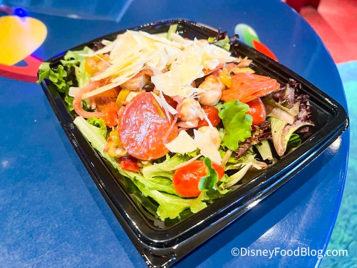 And, it would be a pretty satisfying meal in our opinion! We thought that the produce tasted fresh and the pepperoni added a nice kick to every bite. We really appreciated the generous portion of cheese on top too. The only thing to note on this salad is that it comes with a balsamic vinaigrette (which compliments the ingredients well), so you’ll want to be sure you’re a fan of the dressing before you commit.