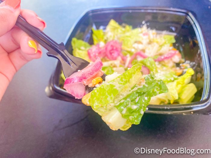 It comes with romaine lettuce, roasted corn relish, diced tomatoes, pickled red onion, feta cheese, and a house-made jalapeño lime ranch dressing. We were a bit disappointed with this salad, as it had great potential but just fell flat in our opinion.