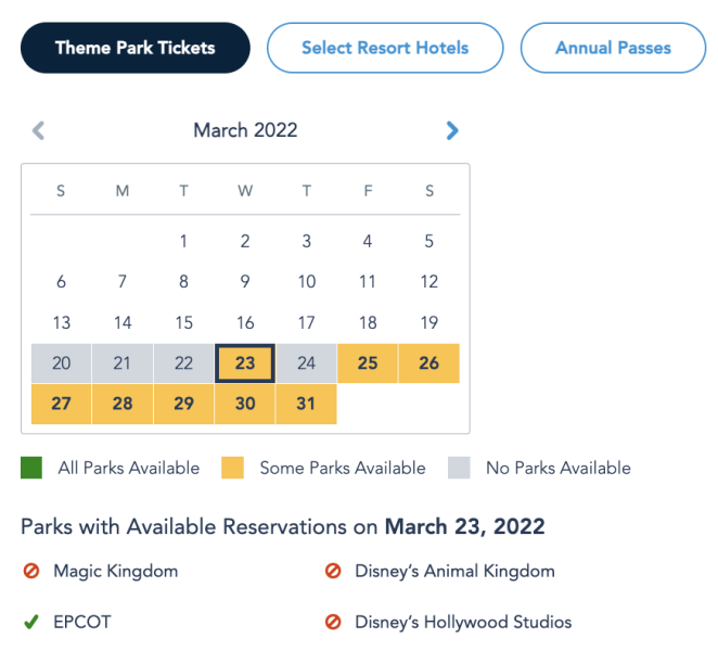 However, if it’s not a runDisney race weekend or the beginning or end of an EPCOT festival, you should be able to consistently score EPCOT park passes within a few weeks of your visit for Sunday-Thursday. It’s often the last pass available, so sometimes you may find that the park empties out in the afternoon, considering some guests just book EPCOT to get into a park, then hop over to the one that they REALLY want to visit.