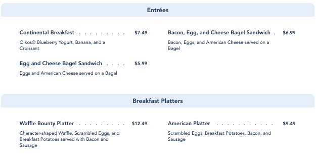 For breakfast, you can choose from a variety of entrées, such as a continental breakfast, a bagel sandwich, or a breakfast platter.
