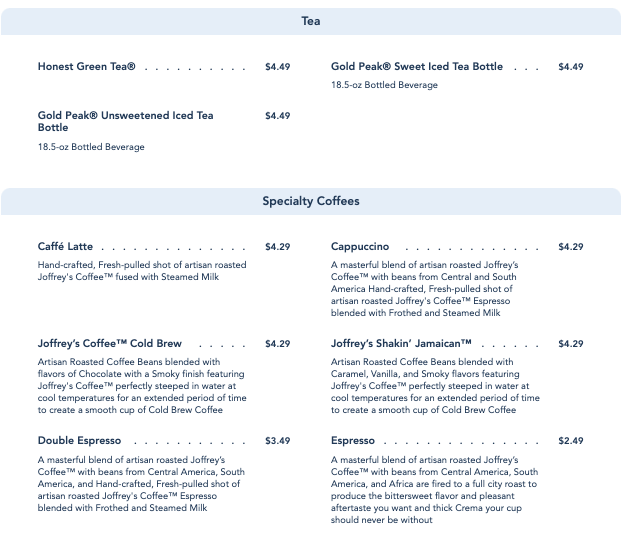 We mentioned before that these restaurants tend to have familiar, comfortable options. At Landscape of Flavors, you won’t find too many surprises on the menu. Mostly, there are options like burgers, pizza, pasta, and other classic American foods. This cafeteria-style spot has 2 different menus — one for breakfast and one for lunch/dinner. The options for drinks are the same at all meals.
