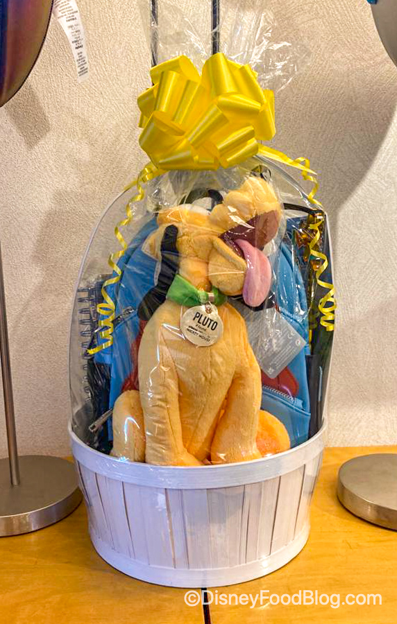 The other Easter Basket we found was Disney Dog-themed! There’s a list attached to the bag showing everything that’s inside and the price of each individual item, so you know what you’re getting before you buy it. In this basket, you’ll find a coloring book, a journal, the Pluto plush, a Disney dogs Loungefly backpack, and more for a value of $168 before tax! Pluto looks a little cramped in here, but this basket is still adorable.