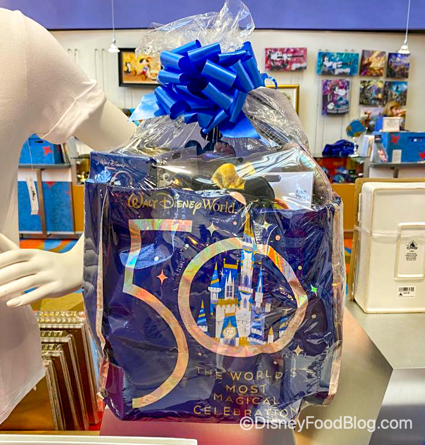 Over at BVG Gifts at Disney’s Contemporary Resort, we spotted these Easter baskets! These are filled with tons of Disney goodies, and normally have a theme. The first one we spotted is for the 5oth Anniversary Celebration of Disney World. The set included things like a Mickey ear hat, a plush, a button set, a folding fan, Easter supplies, and more, all wrapped up in a reusable blue 50th bag! There’s about $175 (before tax) worth of souvenirs in this bag.