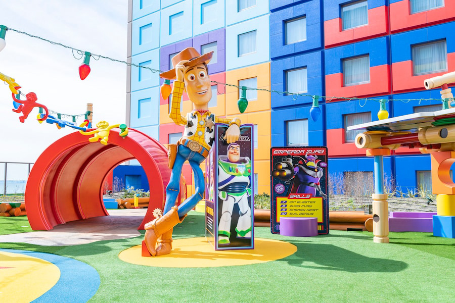 In front of the hotel is Slinky Dog Park, which is where you can find oversized toy action figures of Jessie and Buzz Lightyear that are nearly 12 feet tall (!!) standing on a giant Slinky Dog board game.