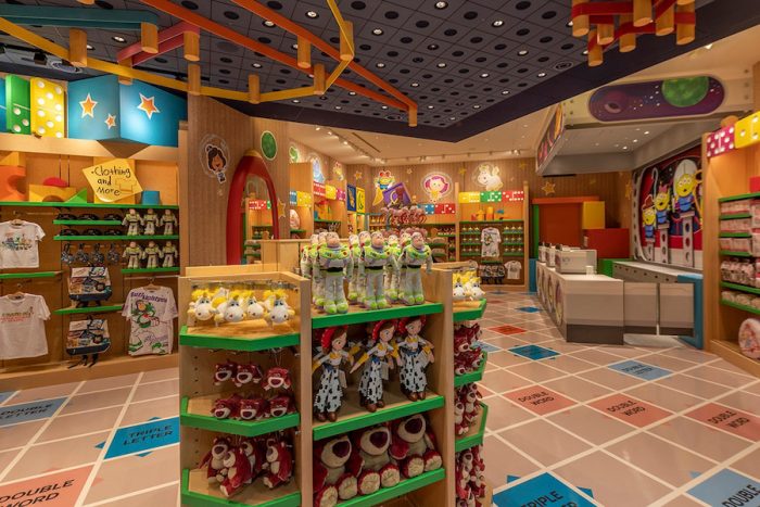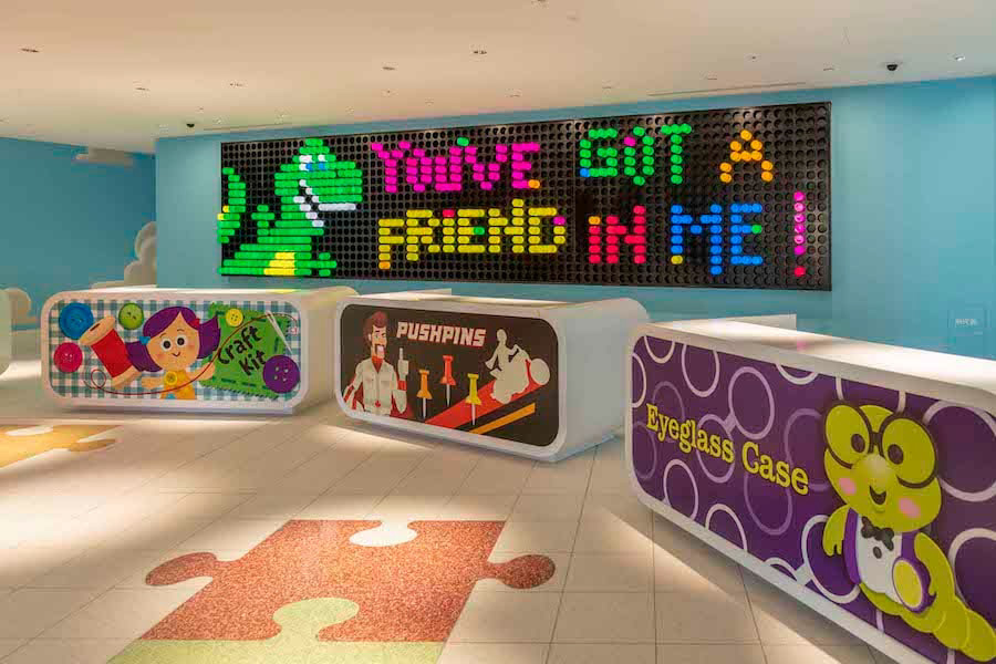 In the lobby, you can see slot cars racing on tracks overhead, a giant Bo Peep game board on the ceiling, puzzle pieces used to decorate the floor, colorful furniture, and more. This is definitely giving us major Toy Story Land vibes, just on a much bigger scale!