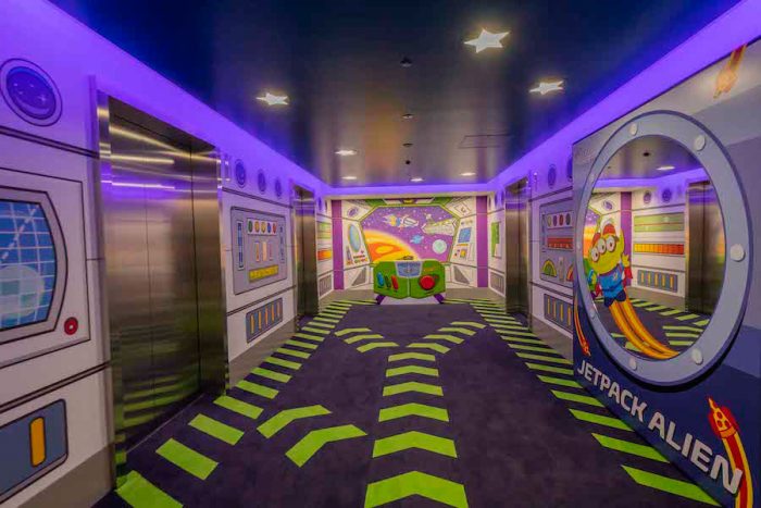 The Toy Story Hotel is so detailed that even the elevator area is themed! The hotel has two wings — one themed to Buzz Lightyear…