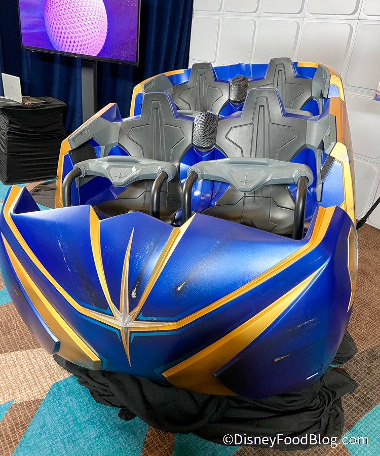 Here’s a closer look at those seats. You can see the safety bars that will help to hold guests in place as they save the galaxy. There are speakers between the seats.