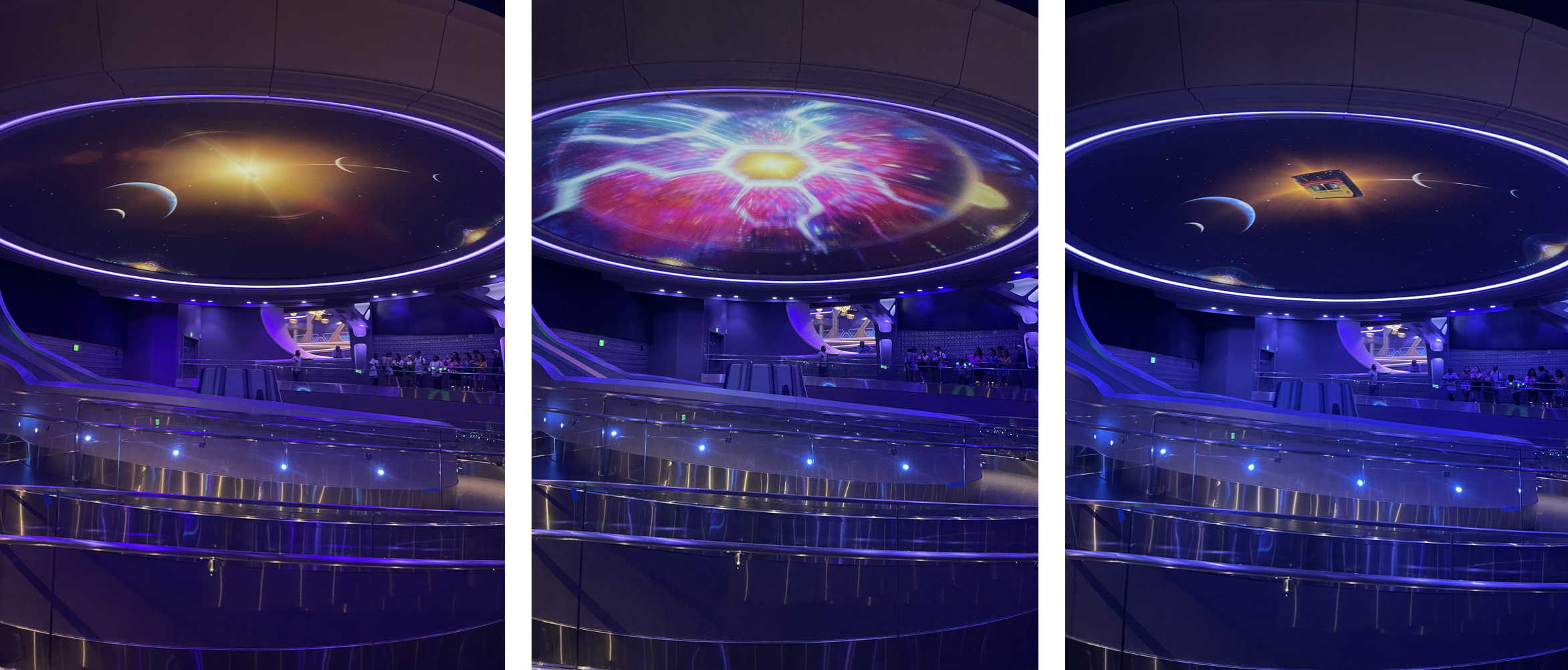 This queue area is meant to be dynamic and is organized around a radial grid. There will be lots of ramps here, winding guests around the space and giving them plenty of angles from which to view the Galaxarium.