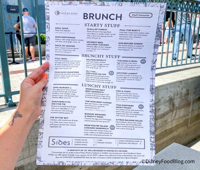 There are several different seating options, including both indoor and outdoor dining. Raglan Road offers standard tables and chairs, booths, bar seating, and outdoor tables and chairs. Depending on where you sit (and if there’s live music playing during your visit), it might be a little noisy. At times, we found it a little difficult to hear our server. Guests are given nice cloth napkins and reusable paper menus. If you decide to dine at Raglan Road, be prepared for some funky, unique options!