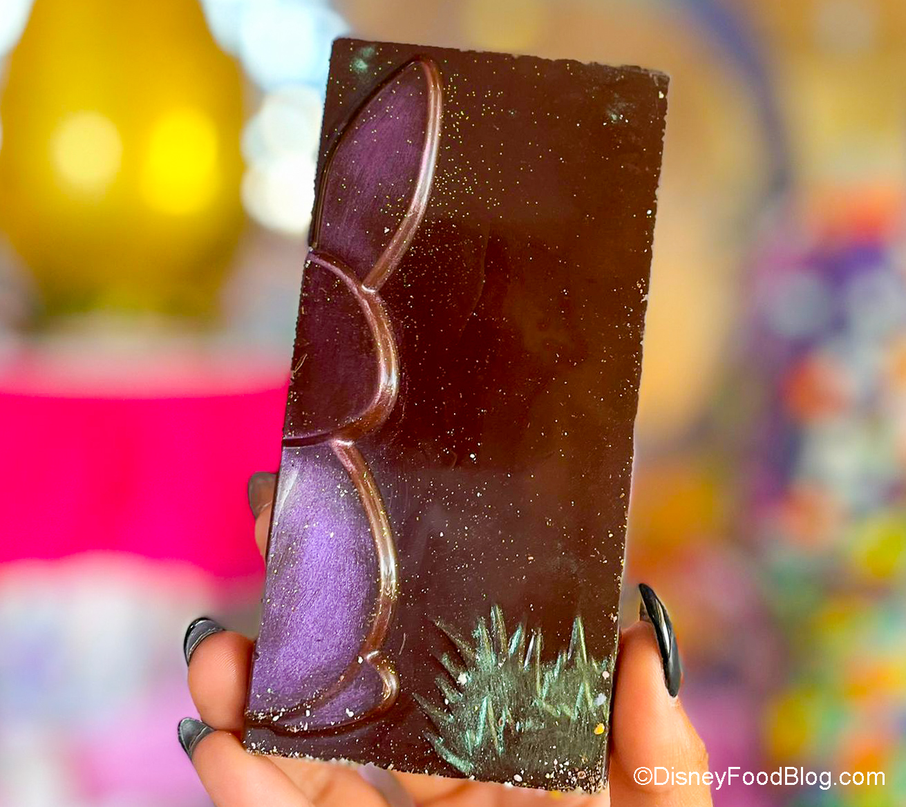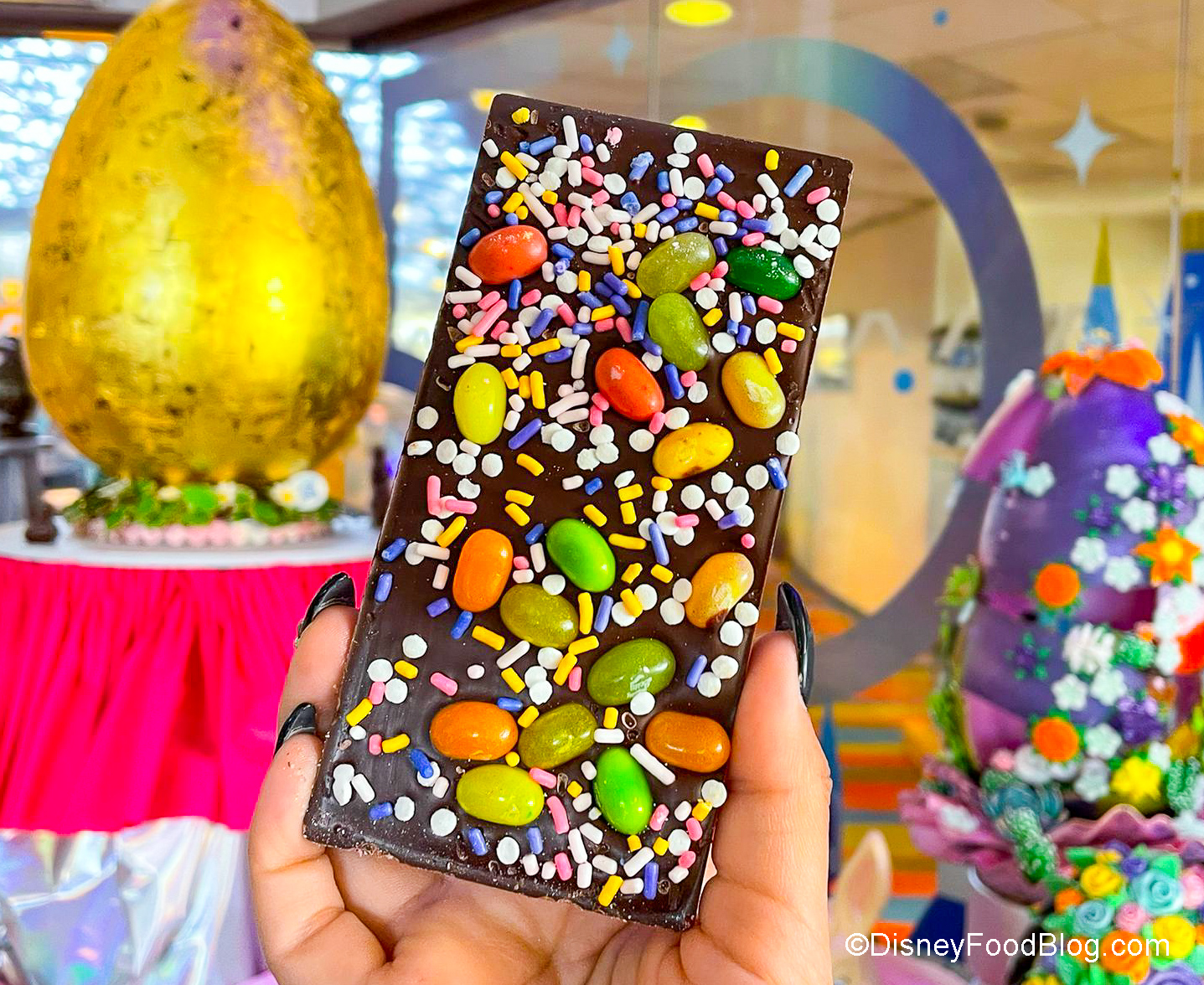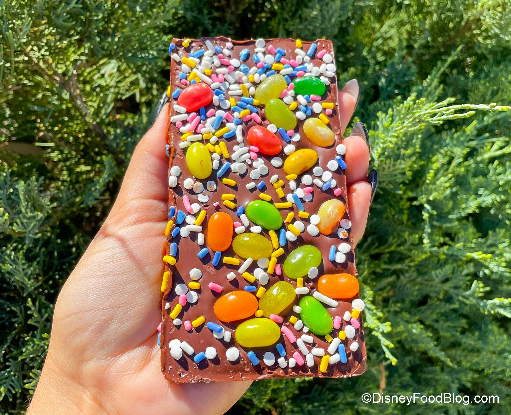 This bark is actually Dark Valrhona Chocolate topped with Sprinkles and Jelly Beans. VERY Easter, if we say so ourselves. This is the good chocolate, too — we love the Valrhona chocolate desserts at the EPCOT festivals. It’s really rich with just a hint of bitterness. But you get a bit of extra sweetness and fun texture from the sprinkles and jelly beans.