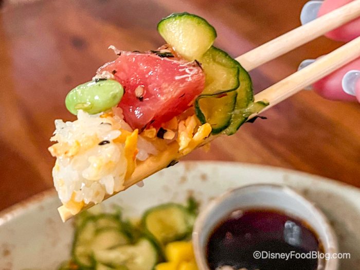 It’s made with Jasmine rice, spicy tuna, dynamite krab, edamame, cucumber, carrots, mango, ginger, avocado, and served with a soy sauce with wasabi on the side.