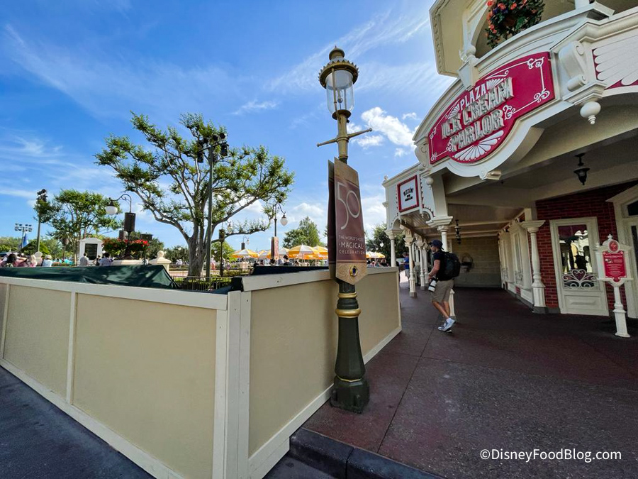 The area outside of the Plaza Ice Cream Parlor is still surrounded by construction walls and green tarp. Disney hasn’t shared what’s going on in this area, but we’ll be sure to let you know when we get more information.