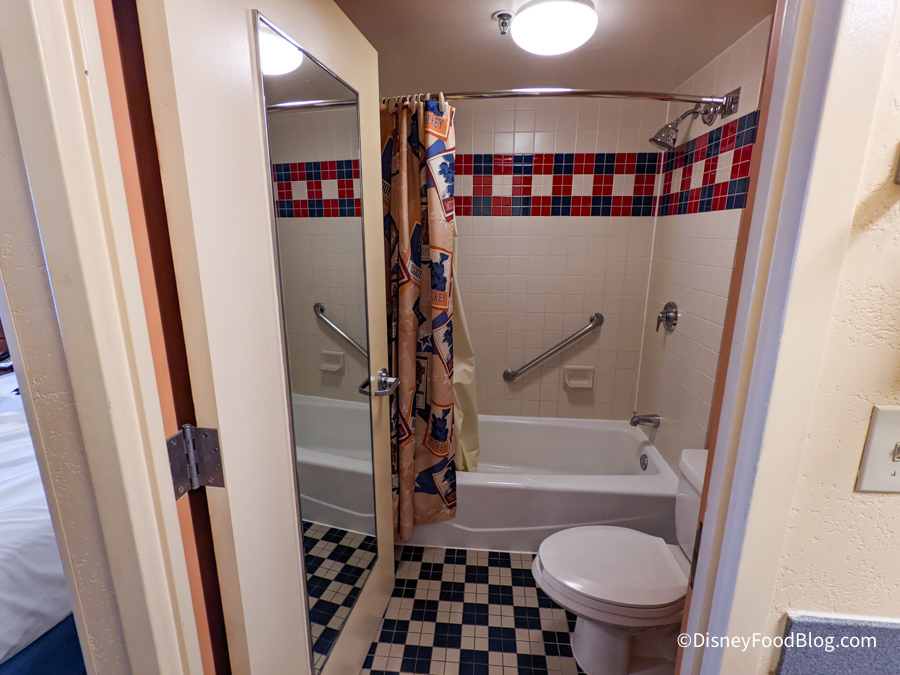 The tile on both the floor and in the shower is checkered, and the shower curtain features Mickey and other characters playing sports.