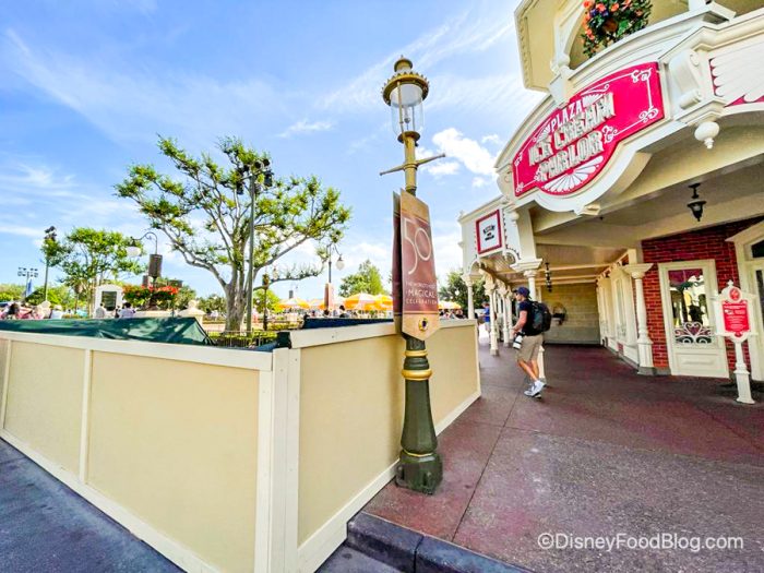 There’s some work going on out in front of the Main Street Plaza Ice Cream Parlor. We noticed there were temporary walls and tarps installed overnight!
