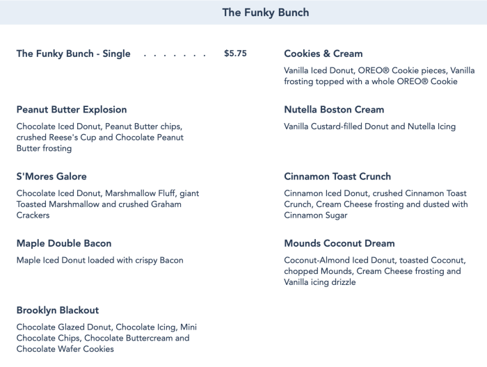 You can find “Funky Bunch” specialty donuts for $5.75 each, with some BIG flavors like Peanut Butter Explosion, Cinnamon Toast Crunch, and Maple Double Bacon.
