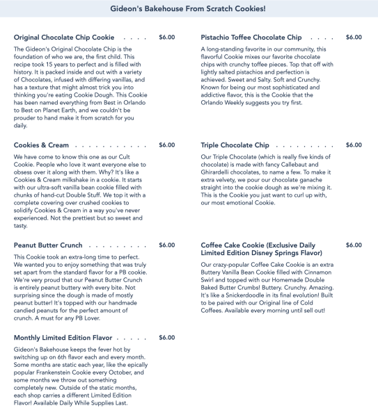 At Gideon’s Bakehouse, you can get one of their made-from-scratch cookies for $6, and your choices include their Original Chocolate Chip Cookie, Pistachio Toffee Chocolate Chip, Cookies & Cream, Triple Chocolate Chip, Peanut Butter Crunch, and a specialty Monthly Limited Edition Flavor, which changes every month. The Coffee Cake Cookie is available daily exclusively in Disney Springs, while it’s only available once a year at the original Gideon’s Bakehouse.