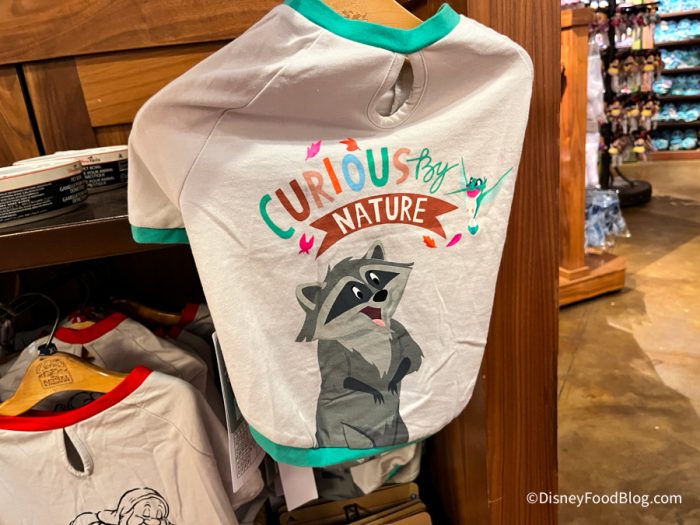 We also saw this shirt for dogs that has Meeko, the raccoon from Pocahontas, and says “Curious by nature.” This shirt is also $24.99.