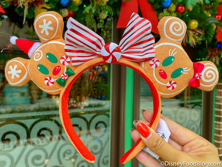 This cutie featured a small gingerbread Mickey and Minnie head on each ear, with peppermint candies all over it, including in the middle of the candy cane-striped bow!