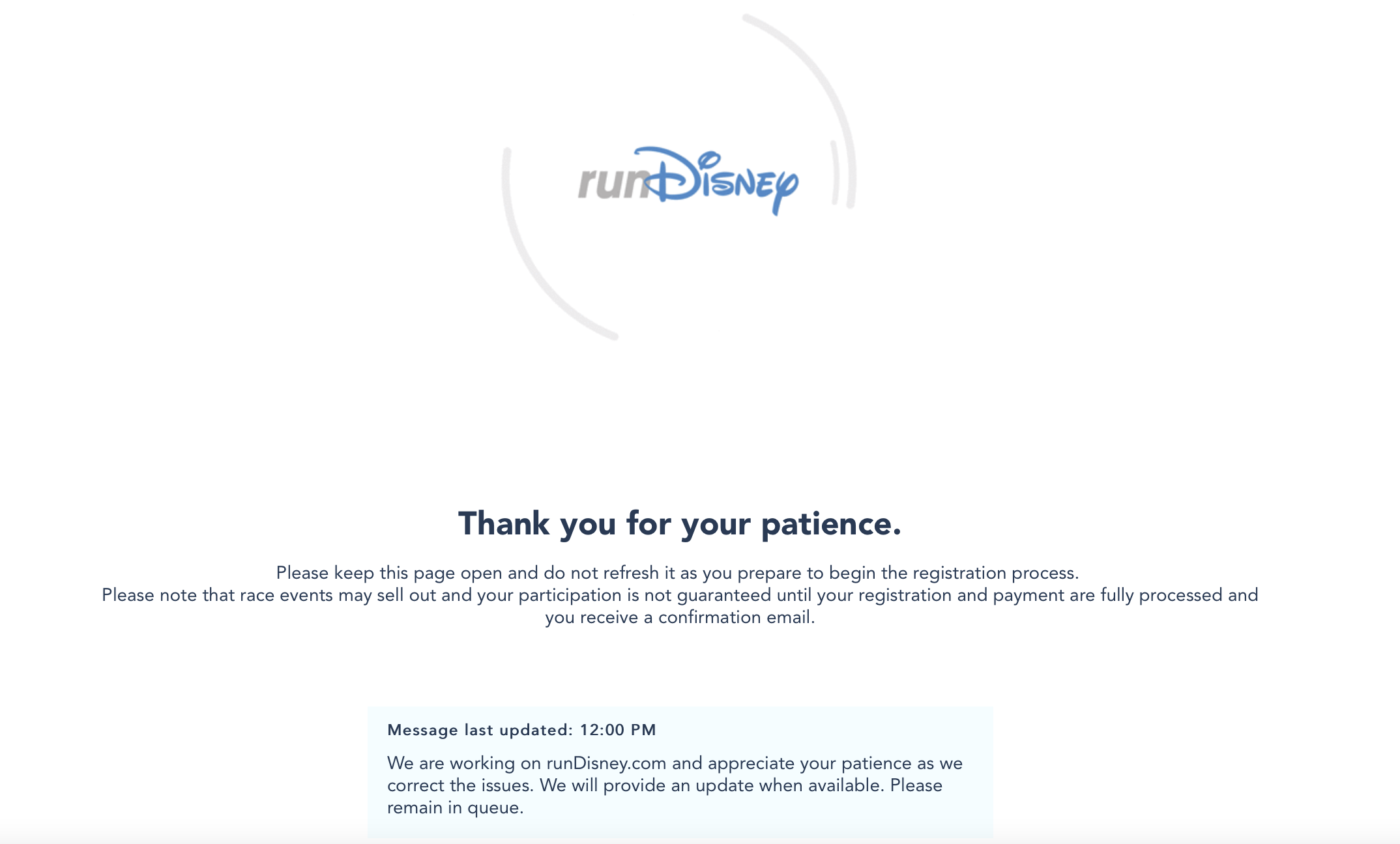 UPDATE: There is now a message on the runDisney website saying that registration for Marathon Weekend will now open at 12:30PM EST and to NOT refresh the page if you are already in the waiting room.