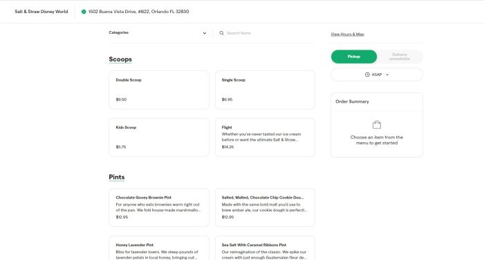 After choosing your flavor(s), you’ll press the green “Add to Order” button at the bottom of the pop-up screen and then press the green “Checkout” button to the right. At that point, you’re taken to a review screen. That’s where it will confirm your order details and process payment. Then, press that green “Place Pickup Order” button at the bottom of the page, and you’re good to go — just head to Salt & Straw in Disney Springs when it’s time!