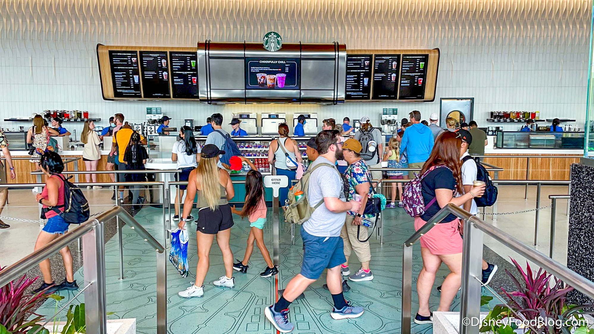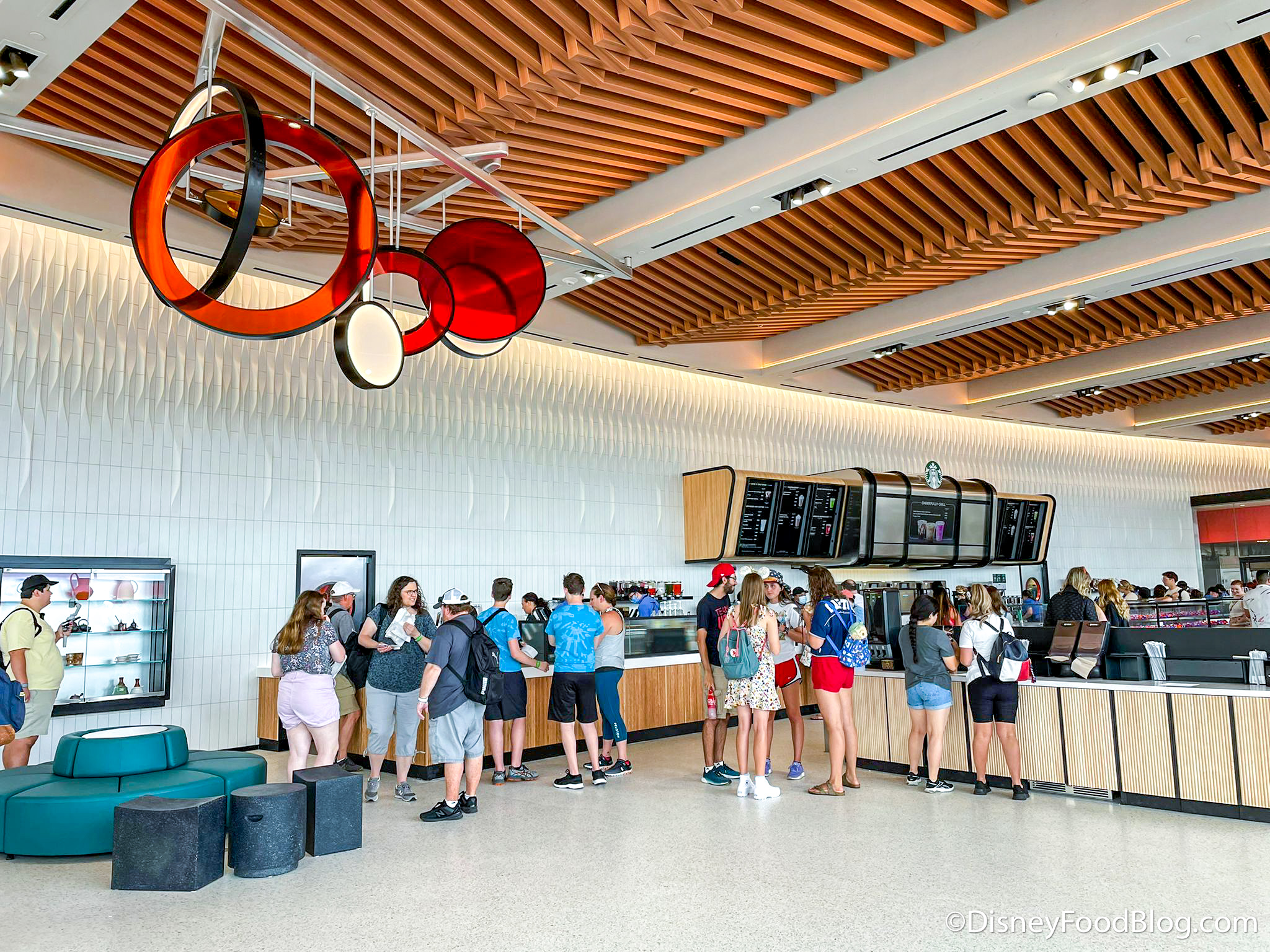 The Starbucks location near World Showcase recently closed in EPCOT, and this is why — Connections Cafe is now the permanent Starbucks in the park! There is a TON of seating in here.