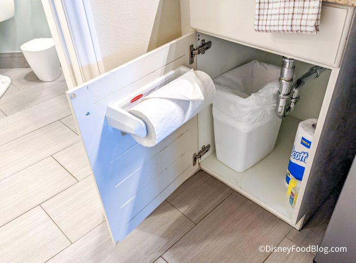 Under the sink, you’ll find some paper towels, a trash can, and extra toilet paper.