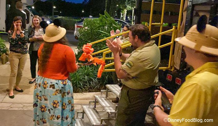 Once everyone had arrived, it was time to load up into the safari vehicle! Before we hopped in, there was a short ribbon-cutting ceremony where the first guest that had checked in for the tour got to do the honors. Cast Members were equally excited to be giving tours once again!