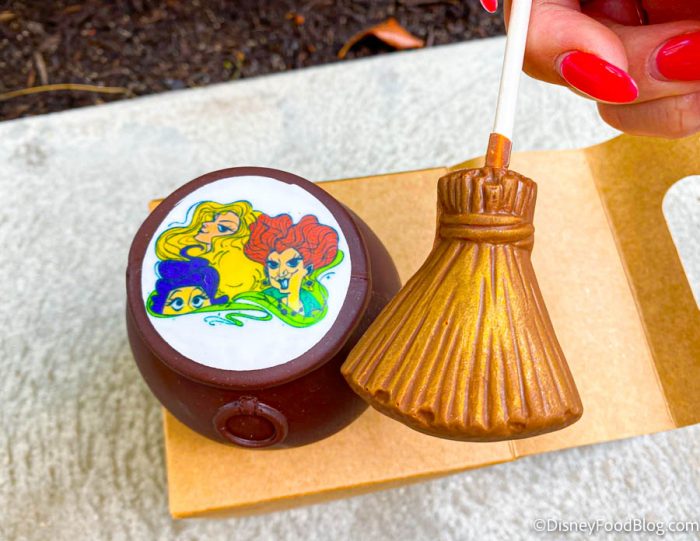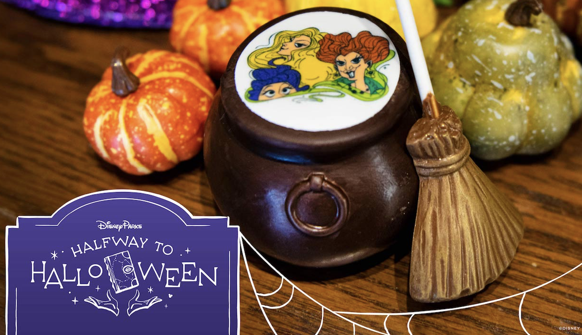 - Sister’s Elixir Hot Cocoa Bomb: Dark chocolate cauldron filled with hot cocoa mix and marshmallows topped with an edible image of the Sanderson Sisters and a chocolate broom stirrer