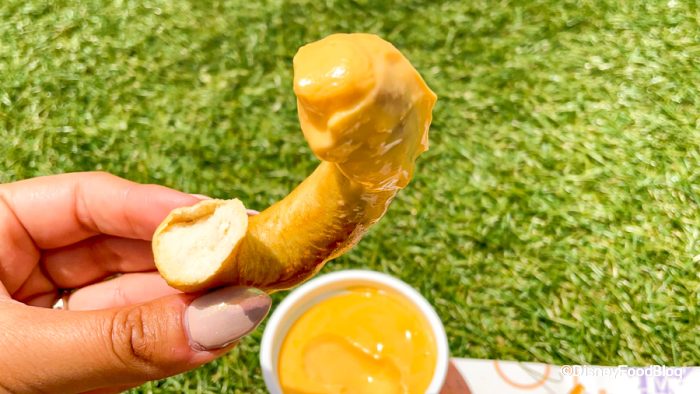 I mean…look at that beautiful dip! (We like to think we have an elite dipping technique.) Mickey Pretzels — with or without cheese sauce — are a vacation staple for many guests.