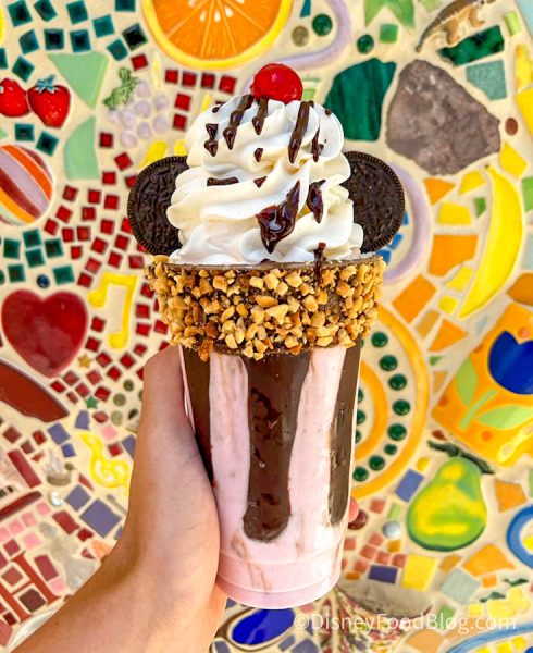 …and the Banana Split Mickey Mouse Shake, which is a Strawberry-Banana Shake with Whipped Topping, Chocolate Sauce, Peanuts, and Crème-filled Chocolate Cookies, topped with a Cherry for $9.49.