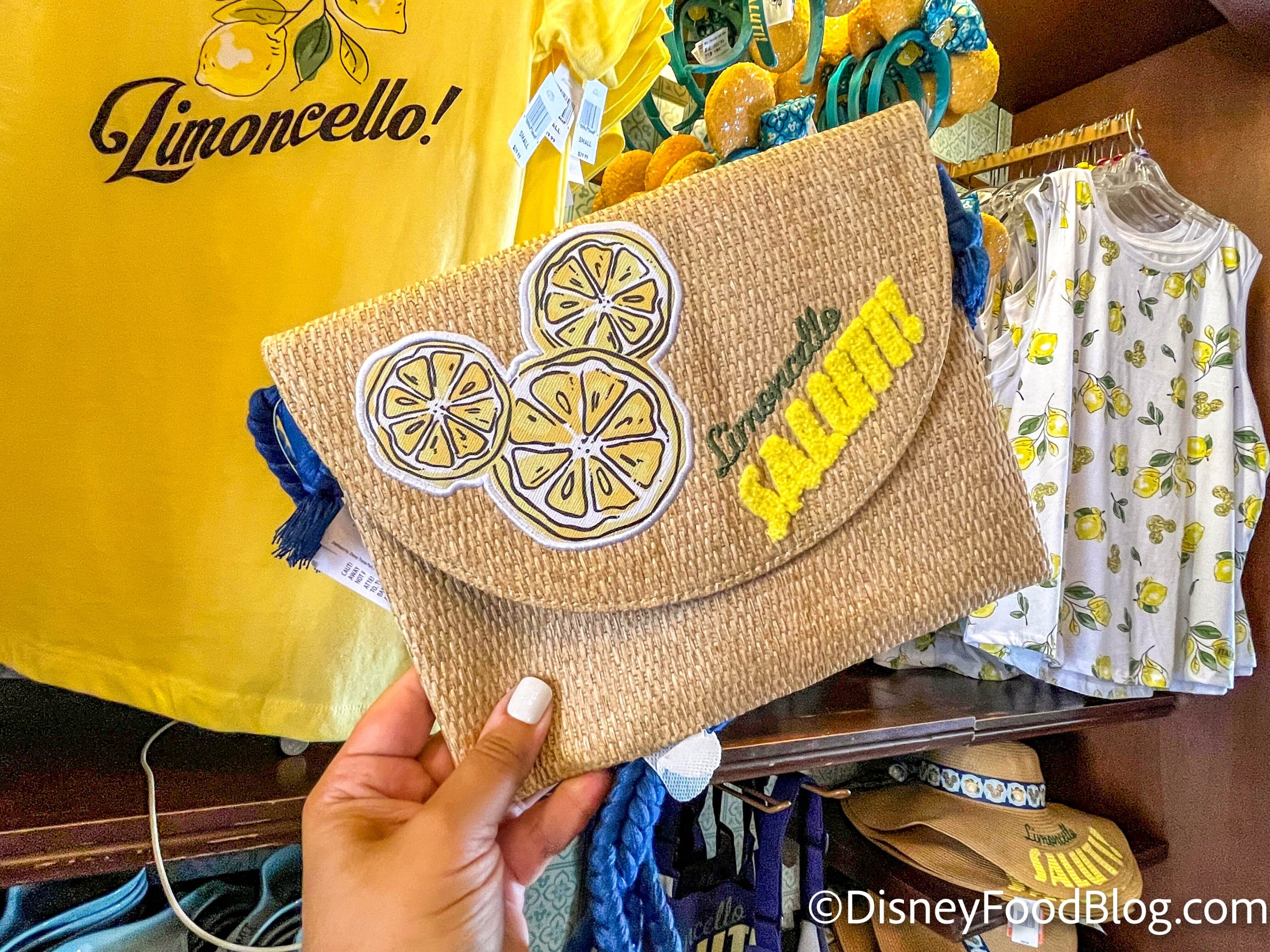 In the Italy Pavilion, we’ve been fawning over the Limoncello collection for a while now, but this week two new bags joined the lineup. First up, there’s this cute small purse made with burlap and finished off with a lemon slice Mickey!