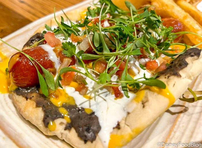 The Craftsman Bar & Grill, which resides in the Grand Californian, is where we grabbed the Hot Dog of the Month! Get your taste buds ready, as May’s Hot Dog of the Month is the Gordita Dog! It costs $13, and has a lightly grilled flatbread with a black bean spread, a beef hot dog, melted cheese, crema, pico de gallo, and micro cilantro served with fries.