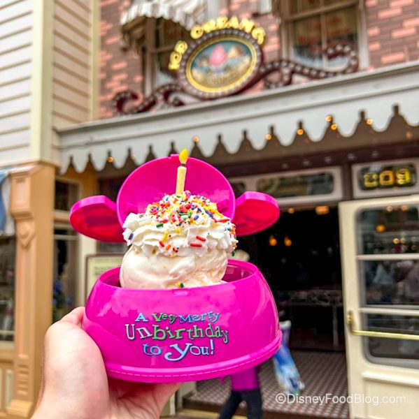 You can get it served in either a Birthday Mickey Ear Hat Bowl or an Unbirthday Mickey Ear Hat Bowl — but we opted for the Unbirthday Bowl!