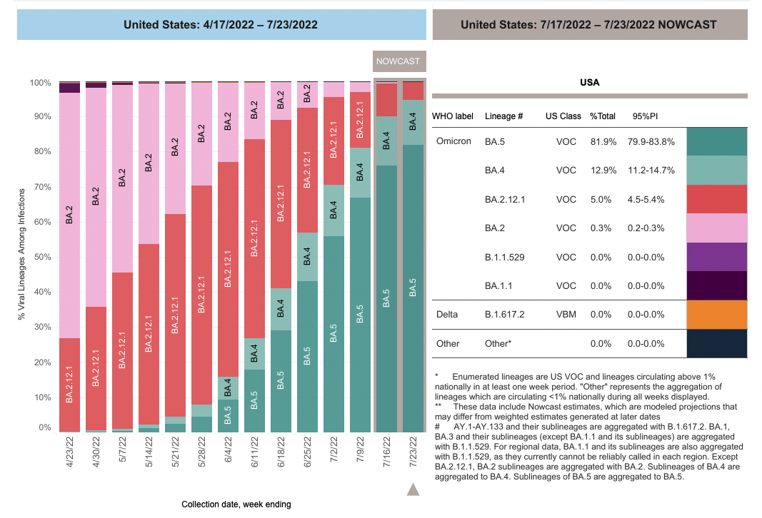 As of late July 2022, CDC data shows that BA.2 (an Omicron subvariant) recently made up around 0.3% of new cases, while BA.2.12.1 made up around 5%. BA.4 now makes up around 12.9% of cases and BA.5 makes up over 80% of cases.